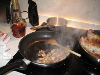 I've been reading Jacque Pepin's Complete Techniques book, which is a combination of two of his previous works from the 70s and I was sitting at the office and I decided to browse online at some of his recipes on Food & Wine's website. Found a recipe for a cassoulet from his short cuts cookbook which caught my attention with the current frigid weather, something hot, filling, and with plenty of cerdo. I printed out the recipe and headed out to the butcher in town. I wasn't able to find the sausages called for in the recipe so I went with a combination of 6 chicken sausages and some delicious pork sausage, and of course pancetta. Bought 2 bottles of alubias at the supermarket, and some cebolletas, and I was set. This is more of an adaptation of the recipe than a direct recreation, due to the fact that the ingredients called for were hard to get a hold of like kielbasa (good luck finding that type of sausage in a market of a small town outside Granada). So I started by pouring the oil and a little water in a pan and adding the sausages once heated.